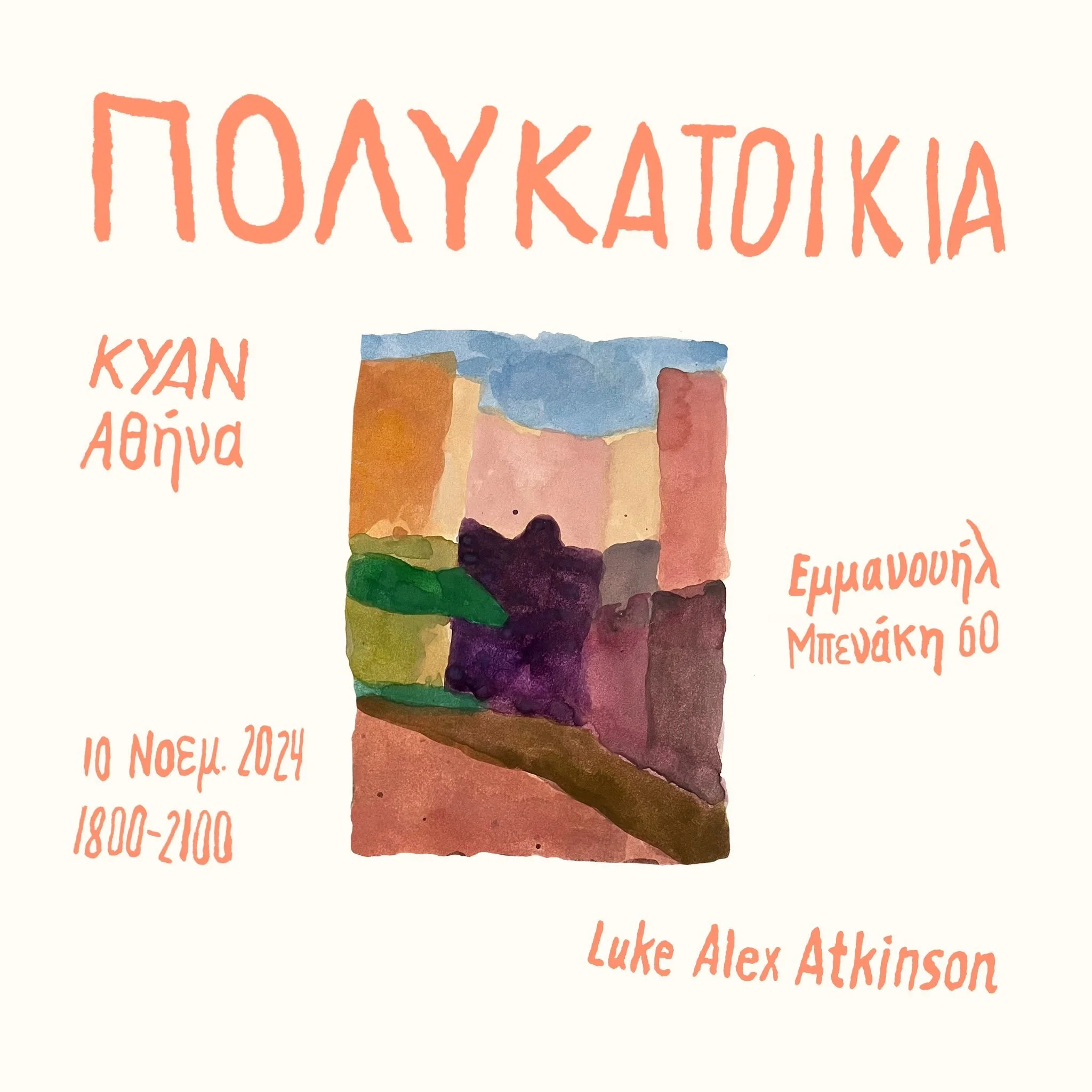 Polykatoikia is a presentation of a new series of works Atkinson produced in Athens during September and October 2024. The artist drew inspiration from his direct surroundings in the studio, while spending time observing the various views of the neighboring buildings. The show is dedicated to the “Polykatoikia”, the Greek term for apartment building.
